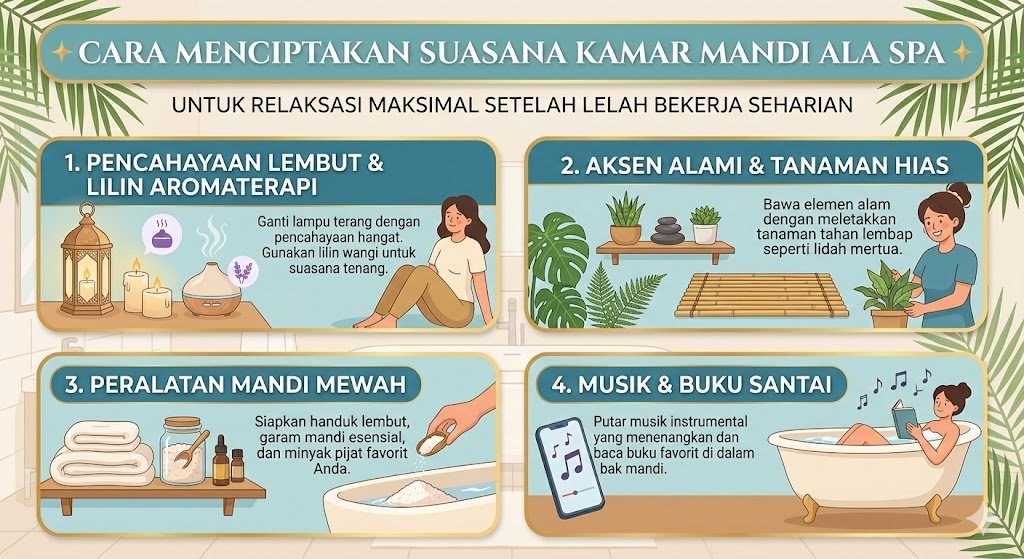 Kamar mandi sering kali dianggap hanya sebagai ruang fungsional untuk membersihkan diri dengan cepat. Namun, bagi Anda yang memiliki rutinitas harian yang padat dan penuh tekanan, mengubah kamar mandi menjadi oase pribadi ala spa dapat menjadi investasi terbaik untuk kesehatan mental dan fisik. Menciptakan suasana relaksasi maksimal tidak selalu membutuhkan renovasi besar yang mahal. Dengan sentuhan desain yang tepat, pengaturan pencahayaan, serta pemilihan elemen sensorik yang menenangkan, Anda bisa menikmati kemewahan perawatan tubuh setiap malam tanpa harus keluar rumah.
