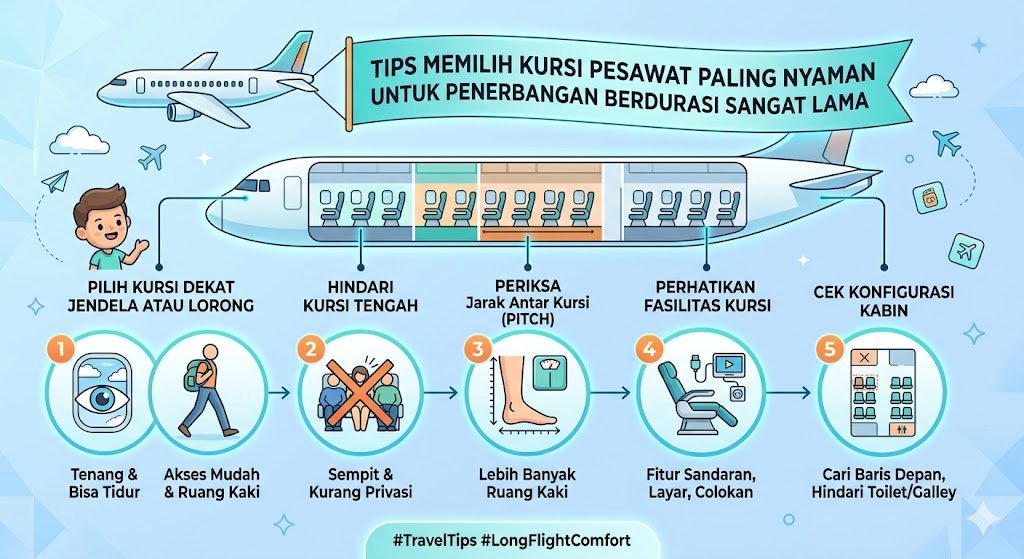 Menghadapi penerbangan berdurasi belasan jam melintasi benua merupakan tantangan fisik dan mental bagi setiap pelancong. Rasa pegal pada punggung, terbatasnya ruang gerak, hingga kesulitan untuk tidur menjadi masalah umum yang sering ditemui di kelas ekonomi. Namun, kenyamanan dalam perjalanan udara sebenarnya dimulai jauh sebelum Anda melangkah ke dalam kabin pesawat, yakni pada saat proses pemilihan kursi. Pemilihan posisi duduk yang strategis bukan sekadar masalah keberuntungan, melainkan hasil dari pertimbangan matang mengenai denah pesawat dan kebutuhan pribadi selama di udara. Dengan memilih kursi yang tepat, Anda dapat meminimalkan kelelahan dan tiba di destinasi tujuan dengan kondisi tubuh yang tetap segar meskipun telah menempuh perjalanan yang sangat panjang.